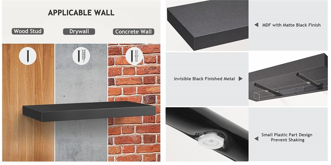 3.غیر مرئی بریکٹ: بہتر دھاتی بریکٹ درست اسکریو کے ساتھ مشابہ شیلف دیوار کے ساتھ مضبوطی سے منسلک کریں گے. 1.4 انچ موٹائی ایم ڈی ایف بورڈز 20 پونڈ تک ہولڈ کر سکتے ہیں, جمع کرنے کے لئے بہت اچھا, تصاویر, کتابیں, ٹرافیاں, چھوٹے پودے, اور بہت کچھ.